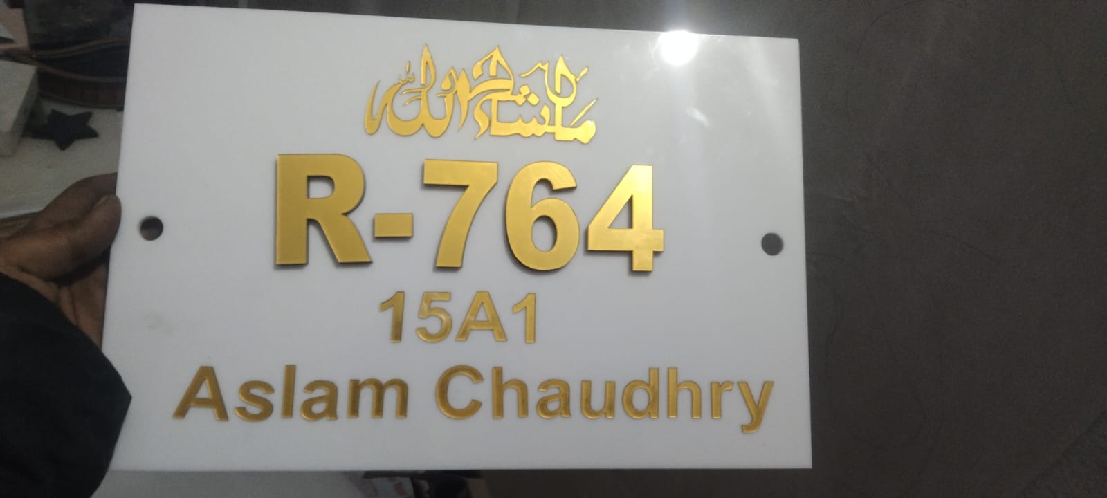 White Acrylic House Nameplate with Golden Mirror Pasting